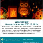 Wir laden alle Familien zum Laternenlauf ein. Während des Spaziergangs singen wir gemeinsam Laternenlieder und hören eine spannende Geschichte. Zum Abschluss gibt es an der Feuerschale leckeren Punsch oder Glühwein und Gebäck.