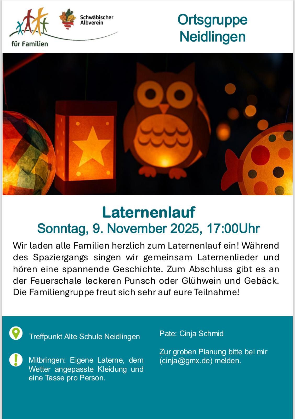 Wir laden alle Familien zum Laternenlauf ein. Während des Spaziergangs singen wir gemeinsam Laternenlieder und hören eine spannende Geschichte. Zum Abschluss gibt es an der Feuerschale leckeren Punsch oder Glühwein und Gebäck.